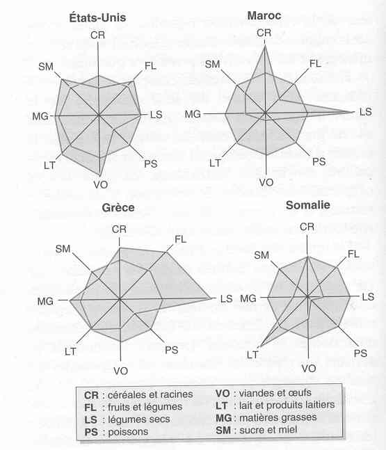 In Figura 1 sono riportati alcuni profili agro-nutrizionali di paesi occidentali e di paesi in via di sviluppo.