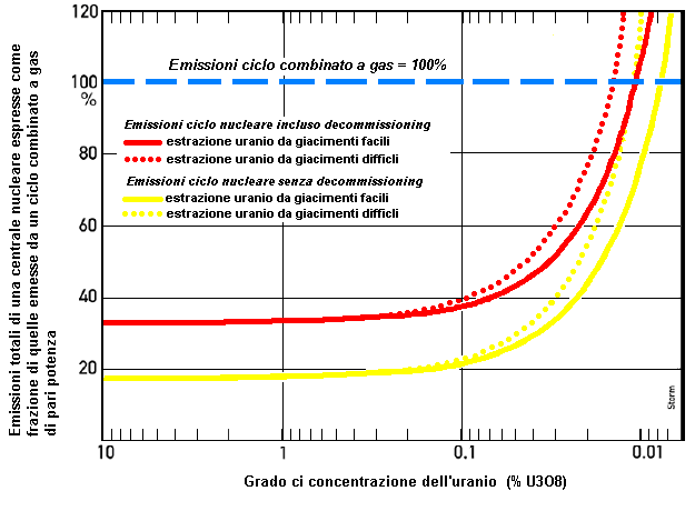 Fig. 3. Confronto delle emissioni totali di CO2 del ciclo combinato a gas e del ciclo nucleare completo (a parità di potenza): si noti la dipendenza cruciale delle emissioni dalla concentrazione dell’uranio nel minerale dal quale viene estratto. Si tenga conto che la scala orizzontale è logaritmica: intervalli uguali corrispondono a variazioni di un fattore 10 [Da: Jan Willem Storm Van Leeuwen e Philip Smith, “Can nuclear power provide energy for the future; should it solve the CO2-emission problem?”, 2005, http://www.stormsmith.nl].