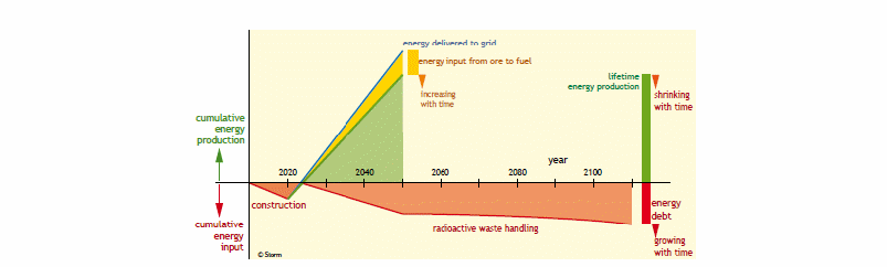 Addirittura dal punto di vista del bilancio complessivo di energia, se nel funzionamento la centrale produce energia (che all’inizio va a compensare quella spesa nei processi “a monte”), accumula peraltro un debito energetico crescente con il tempo, per l’aumento dei residui radioattivi che dovranno essere successivamente trattati: un fisico olandese, Jan Willem Storm van Leeuwen, ha eseguito valutazioni quantitative riassunte nel grafico di fig. 28, nel quale è evidente che il bilancio energetico complessivo sull’intero ciclo di vita di una centrale nucleare è molto deludente.