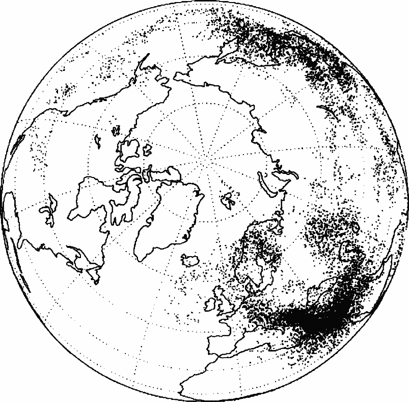 Fig.4. Distribuzione della nube di Chernobyl 10 giorni dopo l’esplosione, modellizzazione del Lawrence Livermore National Laboratory degli USA [Lange, R., Dickerson, M. H. & Gudiksen, P. H. (1992), “Dose estimates from the Chernobyl accident”, Nucl.Techn. 82: 311–322].