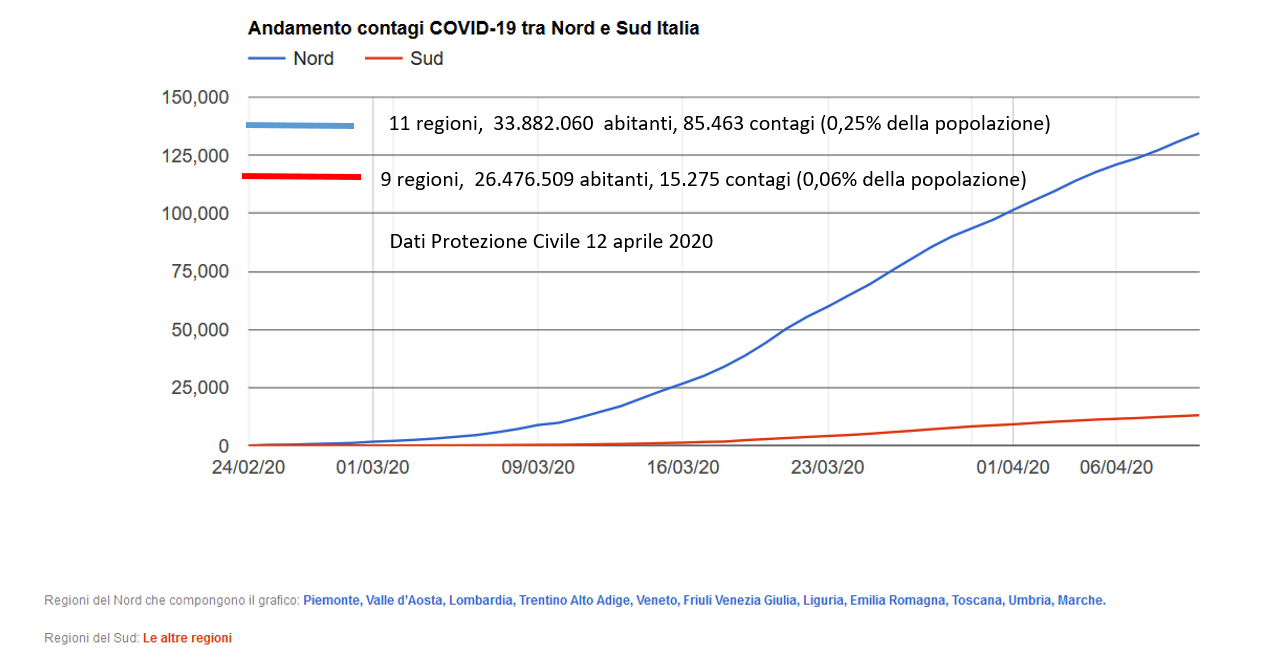 L’andamento della curva dei contagi nelle diverse zone d’Italia è difficilmente spiegabile e meriterebbe sicuramente più attenzione di quanta ne riceve dai media. Ancor più la percentuale di popolazione positiva, che risulta essere, secondo i miei calcoli basati sui dati disponibili al 12 aprile 2020, dello 0,25% del totale per le regioni del nord e dello 0,06% per le regioni del sud.